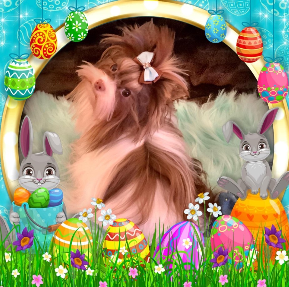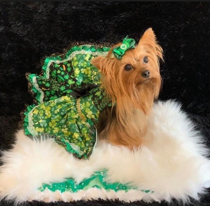 Coco Chanel (above) is the perfect model when it comes to perfection. She is a White Chocolate Yorkie all dressed for Easter. She is playful and best known by all her friends as “Oh No, Coco.” Gidget (below) is dressed for a wonderful St. Patrick’s Day.